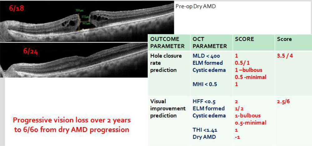 - MAIN OUTCOME MEASURE : Predictive value of pre-op OCT parameters with respect to anatomic closure and visual outcome after macular hole surgery