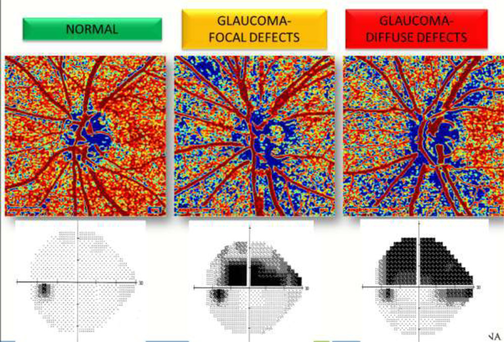 Figure 1:shows the OCTA image and visual fields in a normal eye, glaucomatous eye with focal defects and glaucomatous eye with diffuse defects.