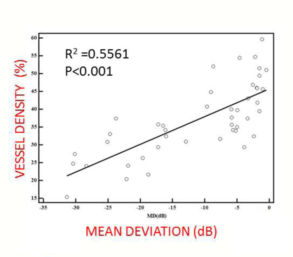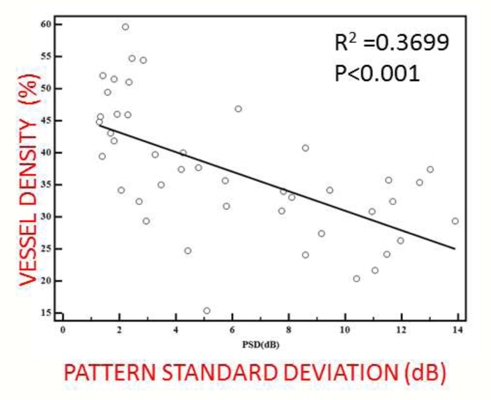 Vessel density shows good negative correlation with mean deviation(R2=0.5561,p<0.001), and pattern standard deviation(R2=0.3699,p<0.001).