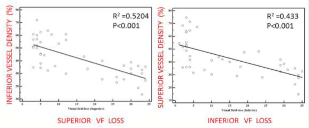 Also superior vessel density had a good negative correlation with inferior field loss(R2=0.433,p<0.001), and inferior vessel density had a good negative correlation with superior field loss(R2=0.5204,p<0.001).