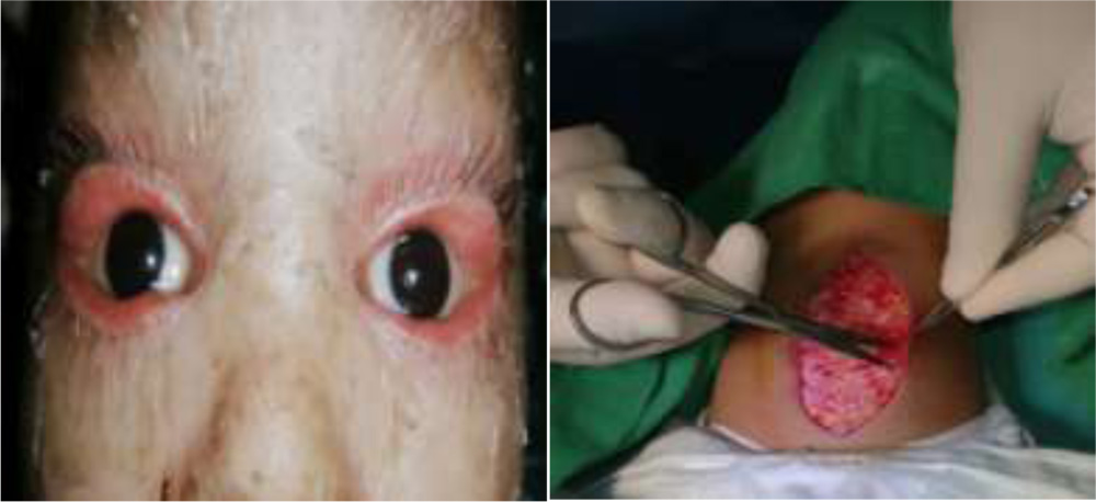 There were no areas of skin unaffected by the scaling process. Considering the age of the patient, no available autologous healthy skin, easy availability of maternal skin and economic constraints, ectropion repair using maternal allograft was planned in our patient.