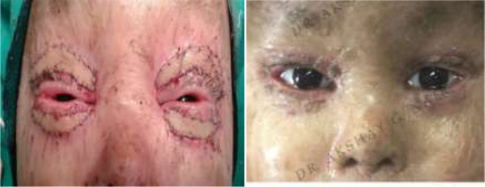 (Clockwise from top left) figure1:bilateral cicatrical ectropion. figure2:maternal autograft harvest