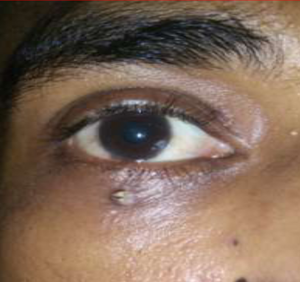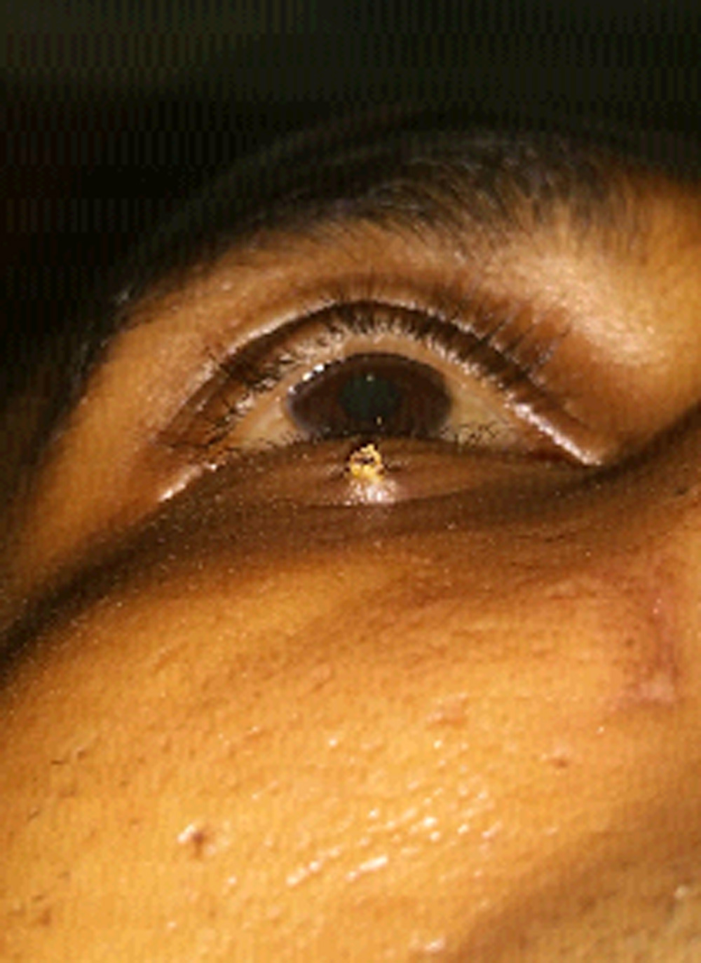 Patient did not follow up and presented directly after 3 weeks with complaints of increased pain , swelling of lower lid with an excresence at the CLW site, vision of 6/9 improving to 6/6 and healed conjunctival tear. Diagnosis of lower lid a suture granuloma was made and a Computed Tomography (CT) scan of orbit was advised.